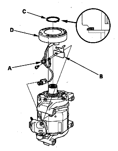 4. Remove the screw, the wire harness clip (A), and the holder (B). Remove the snap ring (C) with snap ring pliers, then remove the field coil (D). Be careful not to damage the field coil or the A/C compressor.