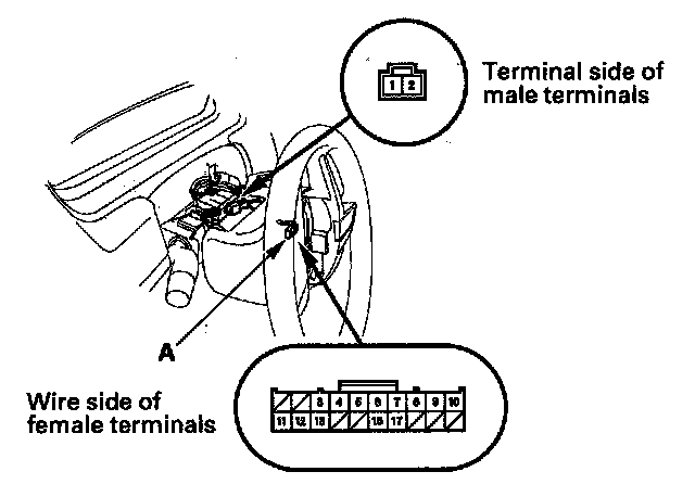 8. Connect the cable reel subharness 20P connector (A) No. 11 and No. 12 terminals with a jumper wire. The horns should sound.