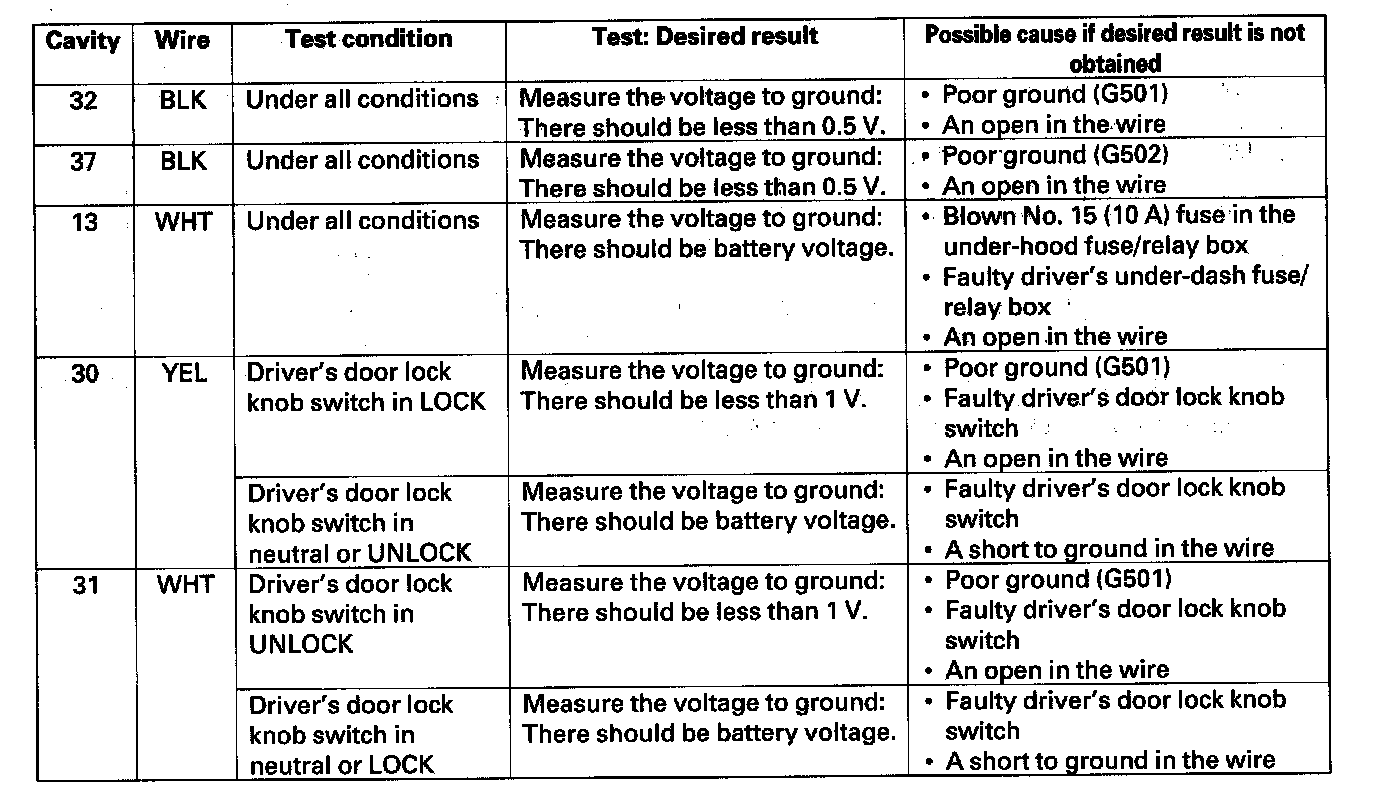 12. Reconnect the 37P connector to the door multiplex control unit, and make these input tests at the connector.