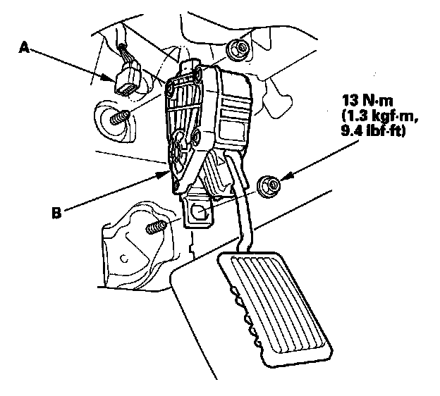 2. Remove the accelerator pedal module (B).