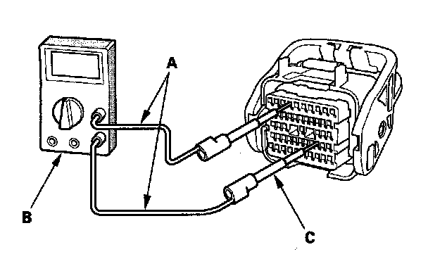 5. Connect one side of the patch cords (A) terminals to a commercially available digital multimeter (B), and connect the other side of the patch cord terminals to a commercially available banana jack (Pomona Electronics Tool No. 3563 or equivalent) (C).