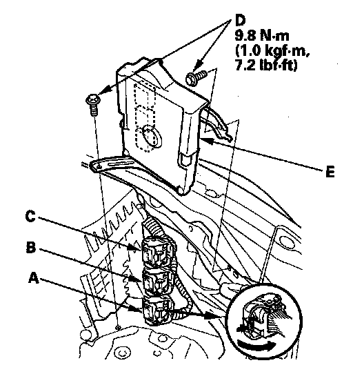 9. Disconnect ECM/PCM connectors A, B, and C, then remove the ECM/PCM assembly (E).