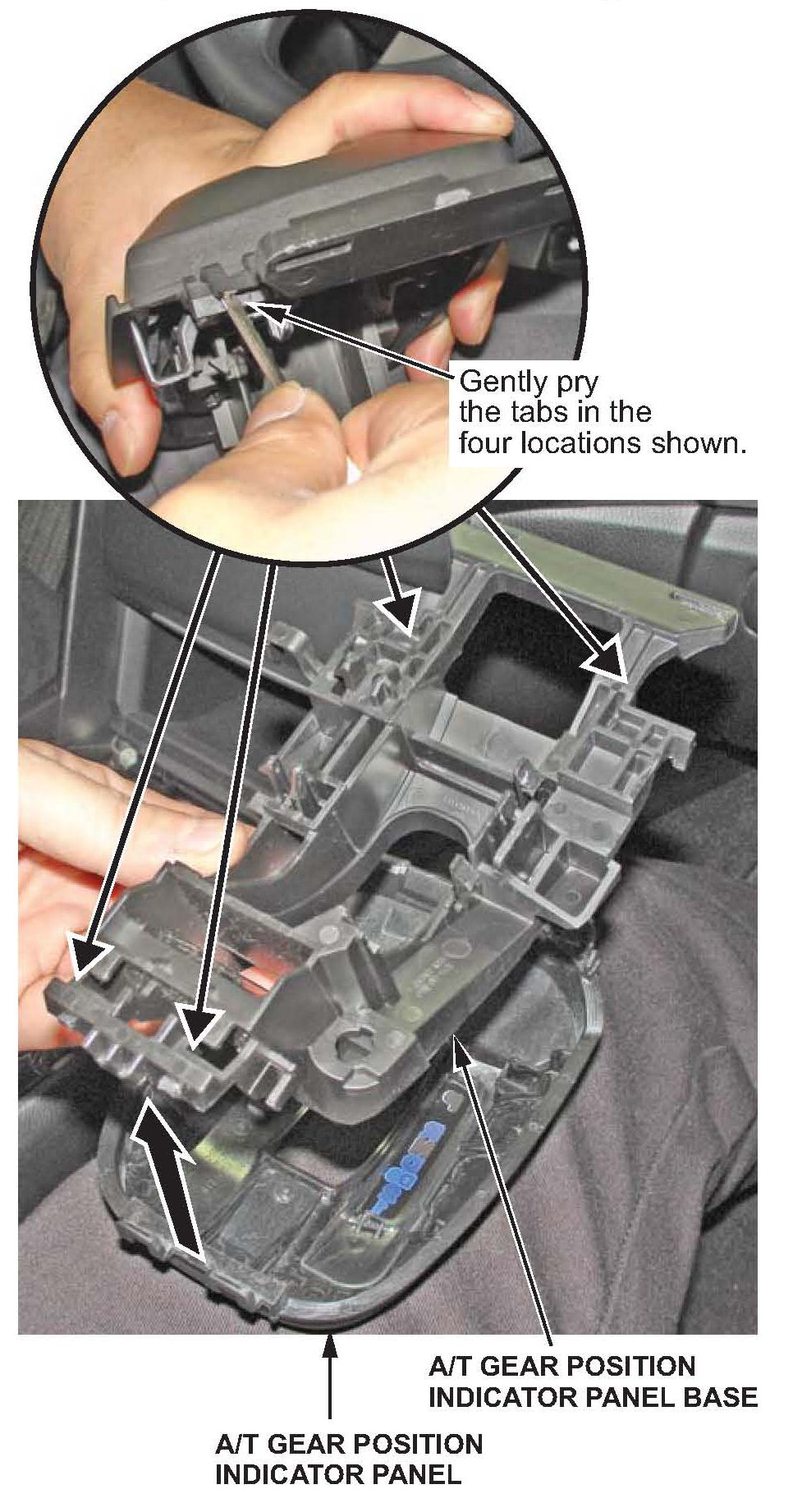 7. Type B shift lever: Remove the A/T gear position indicator panel by gently prying up on the four retaining tabs that secure the panel to the base.
