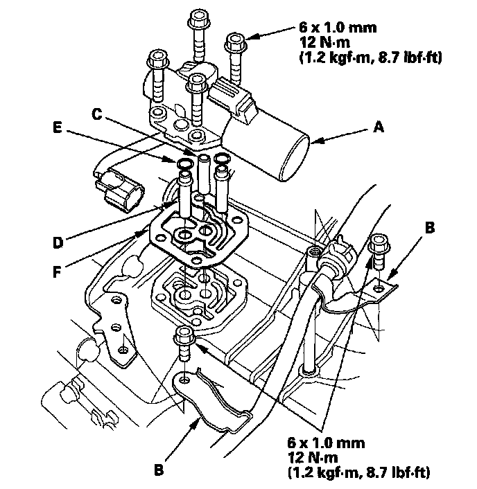 10. Remove the ATF pipe (C), the ATF joint pipes (D), the O-rings (E), and the gasket (F).