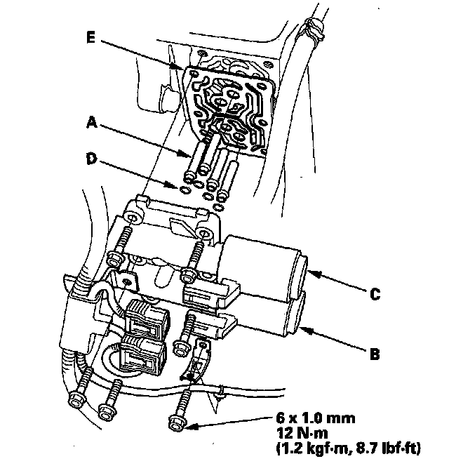 14. Disconnect one of the jumper wires, and check the valve movement at the fluid passage in the valve body mounting surface. If the valve binds or moves sluggishly, or if the solenoid valve does not operate, replace A/T clutch pressure control solenoid valve B and C.