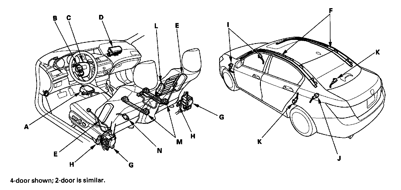 The SRS is a safety device which, when used with the seat belt, is designed to help protect the driver and front passenger in a frontal impact exceeding a certain set limit. The system consists of the SRS unit, including safing sensor and impact sensor (A), the cable reel (B), the driver's airbag (C), the front passenger's airbag (D), side airbags (E), side curtain airbags (F), seat belt tensioners (G), side impact sensors (first) (H), front impact sensors (I), rear safing sensor (J), and side impact sensors (second) (K).