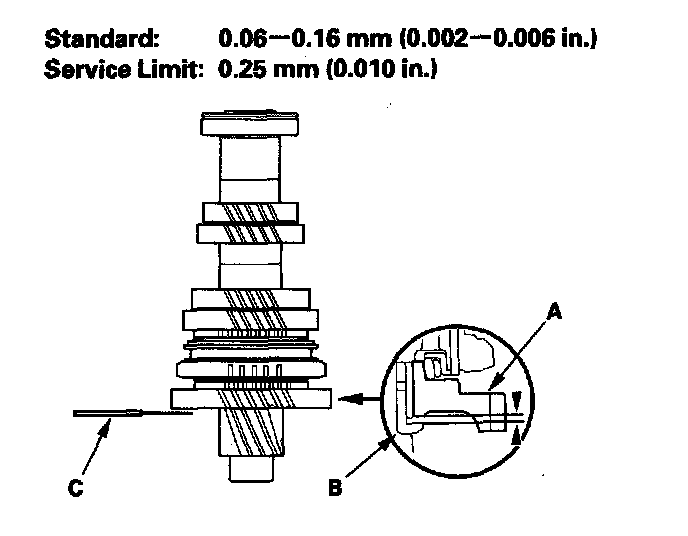 Countershaft Assembly Clearance Inspection1. Measure the clearance between 1st gear (A) and the distance collar (B) with a feeler gauge (C). If the clearance is more than the service limit, go to step 2.