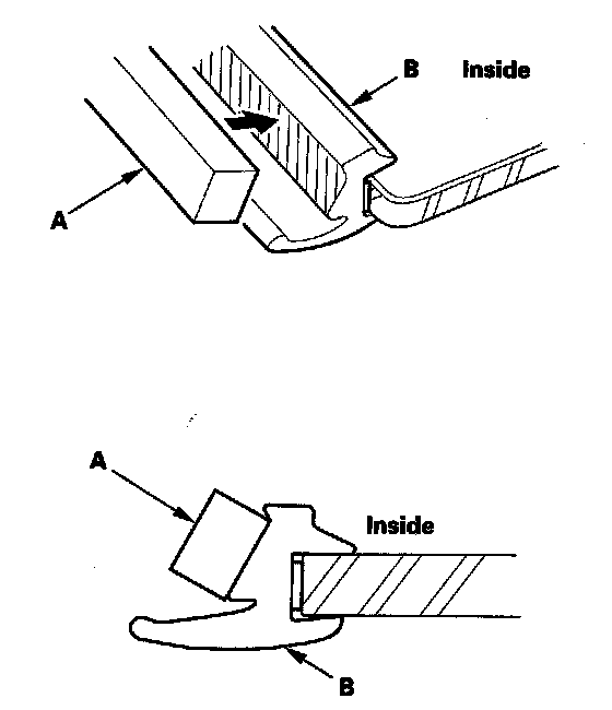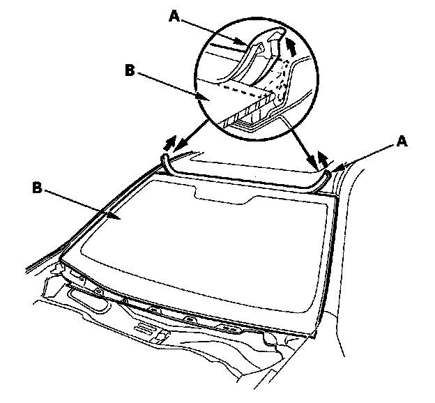 2. Remove the molding (A) from the upper edge of the windshield (B). If necessary, cut the molding with a utility knife.