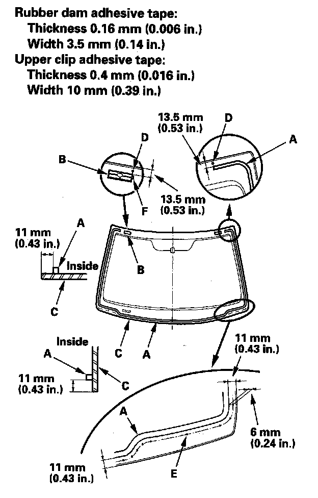 12. Attach the rubber dam A, and the upper clips (B) with adhesive tape to the inside face of the windshield (C) as shown. Before installing the upper clips, apply primer to the area where the adhesive tape will be applied to the inside face of the windshield: