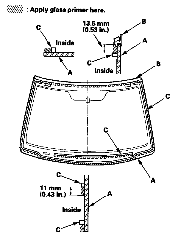 18. With a sponge, apply a light coat of glass primer to the windshield (A) along the edge of the molding (B) and rubber dams (C) as shown, then lightly wipe it off with gauze or cheesecloth: