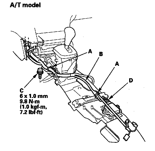 6. A/T model: Remove the bolts securing the shift lever mounting bracket.