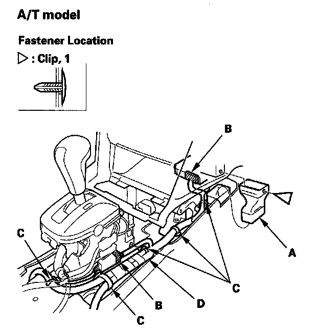 8. Remove the clip, and remove the right rear heater joint duct (A). Disconnect the floor wire harness connectors (B), and detach the harness clips (C) fastening the floor wire harness (D).
