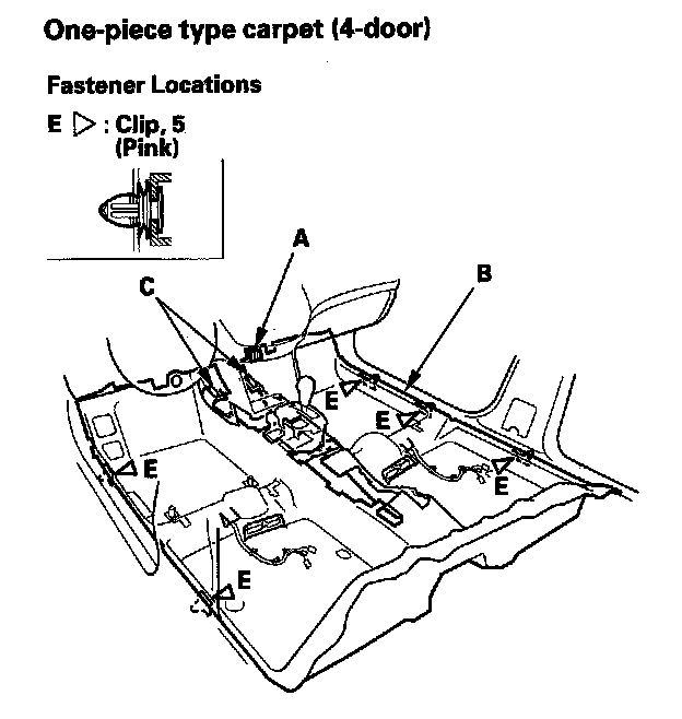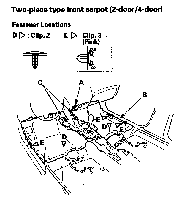 9. Release the Velcro fastener (A), and release the carpet (B) from the hooks (C) of both rear heater ducts. On the two-piece type carpet, remove the clips (D). Detach the clips (E) fastening the carpet to both door sill areas: