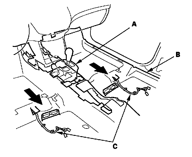 10. While lifting the shift lever (A) up, pull the carpet (B) out from under the dashboard, then remove the carpet. One-piece type carpet: Pull the seat harnesses (C) out through the holes in the carpet.