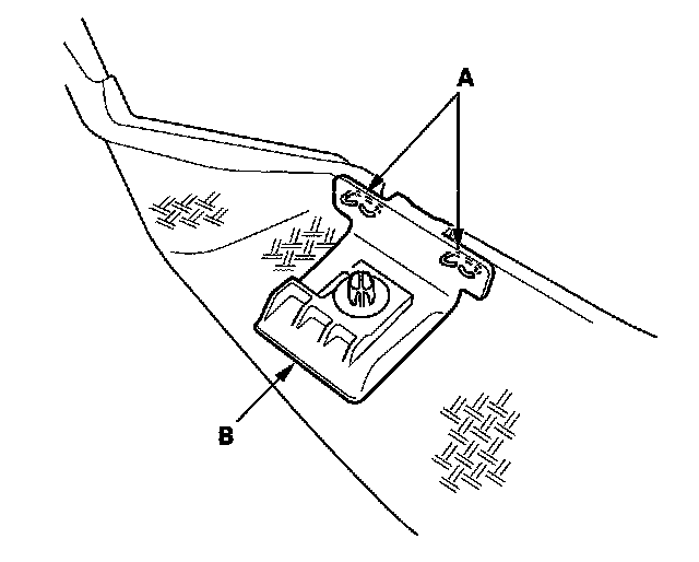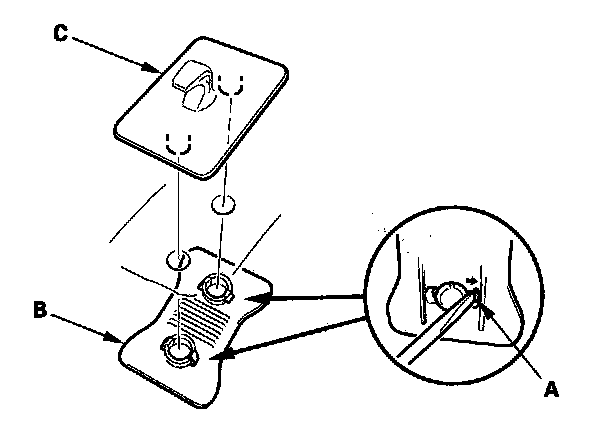 11. If necessary, from back of the carpet, release the hooks (A) of the base (B) with a flat-tip screwdriver, and push up the projections of the holder from the base to remove the floor mat holder (C).