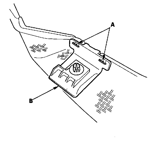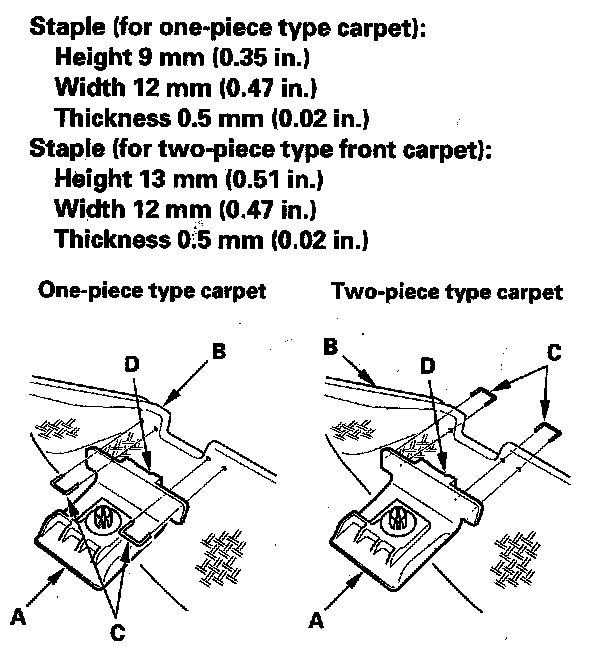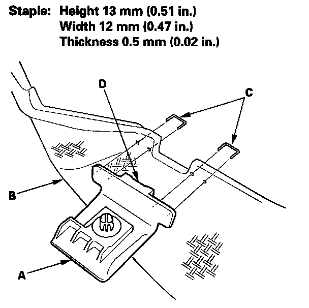 13. If the hook (A) is removed, reinstall the hook to the carpet (B) with new staples (C); fit the projection (D) of the hook to the notch in the carpet, then staple the hook. Bend the projected staple with a flat-tip screwdriver.