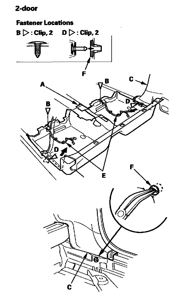 2. On bottom of both rear side trim panels (C) (2-door) or bottom of both B-pillars (4-door), pull the carpet out to detach the clips (D).