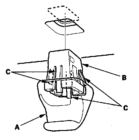 2. While pushing the hook (A) with a flat-tip screwdriver wrapped with protective tape, release the sunvisor (B) from the holder (C), and rotate the sunvisor backward 45°. Then make sure the hook slides into the bracket cover as the rotating the sunvisor.