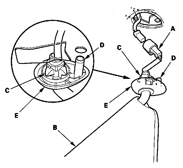 10. Connect the vanity mirror light connector (A), and set the sunvisor (B) by inserting the bracket (C) and the pin (D) of the bracket cover (E) to the hole in the body.