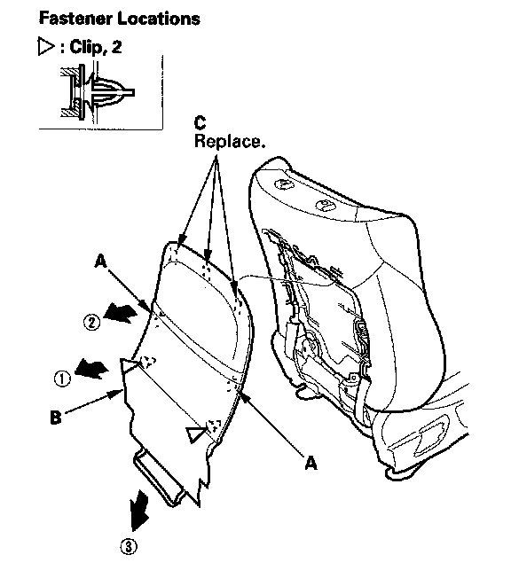 3. Detach the clips, and release the hooks (A) by pulling the bottom of the back cover (B) back, then gently pull down the cover to release the hooks (C) from the seat-back frame, and remove the cover.