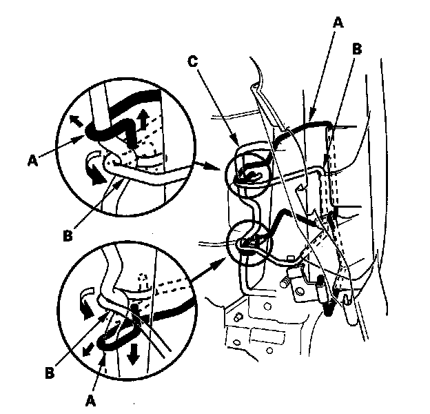- Reinstall airbag wire A, B, and the bracket (F) of airbag wire C securely.