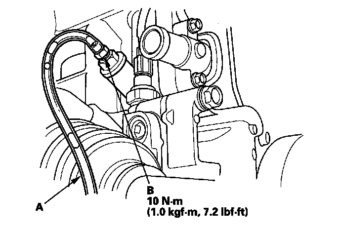4. Install a rubber hose (A) on the drain bolt (B) located at the rear of the engine block, then loosen the drain bolt.