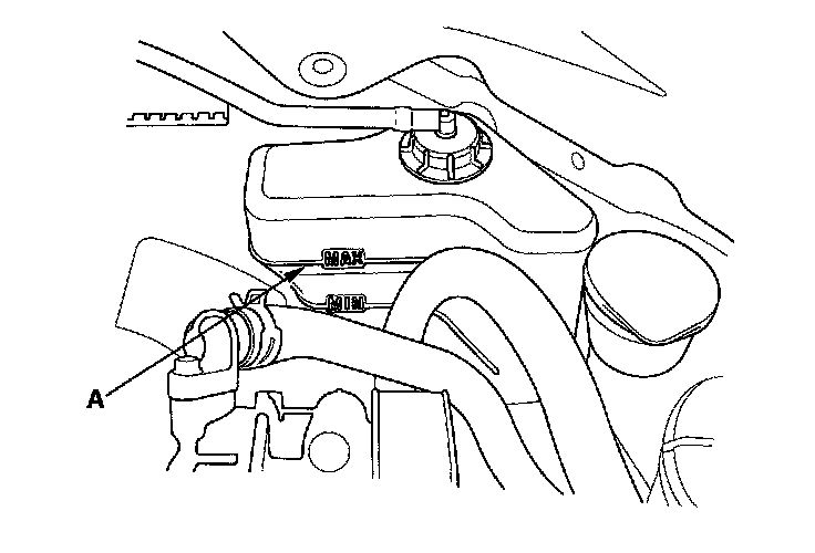 8. Fill the coolant reservoir to the MAX mark (A) with Honda Long Life Antifreeze/Coolant Type 2 (P/N OL999-9011).