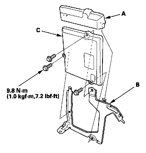 10. Remove the cover (A) and the bracket (B) from the ECM/PCM (C).