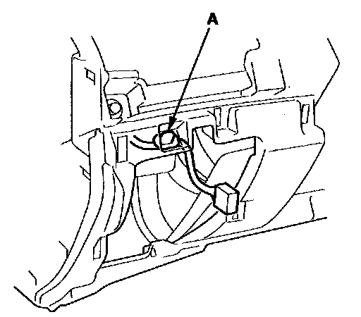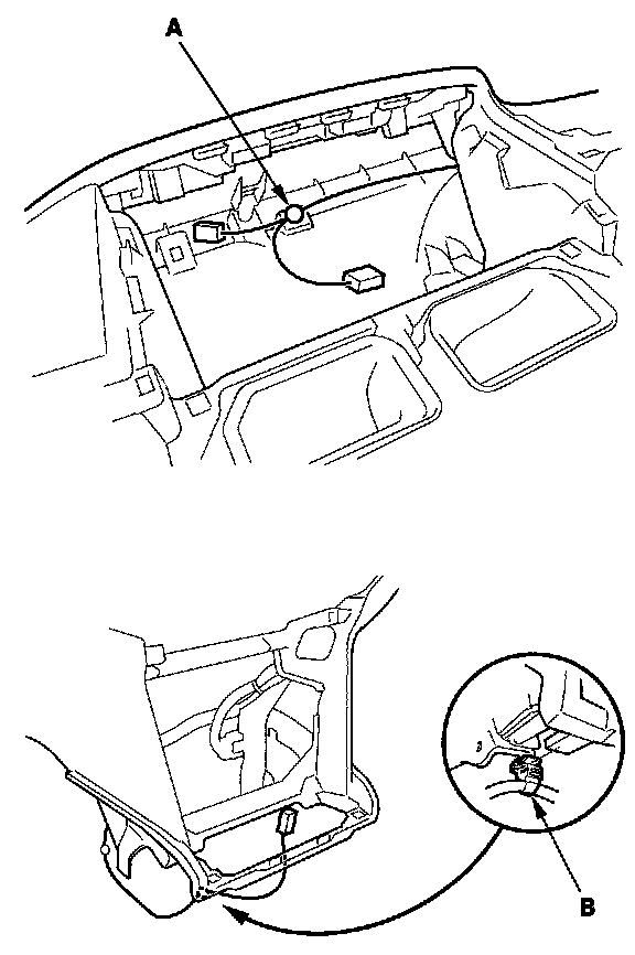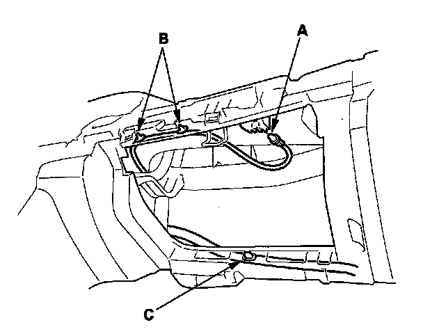 7. Disconnect the glove box light bulb socket (A), and detach the harness clips (B) from the dashboard duct. Detach the harness clip (C) from the dashboard.