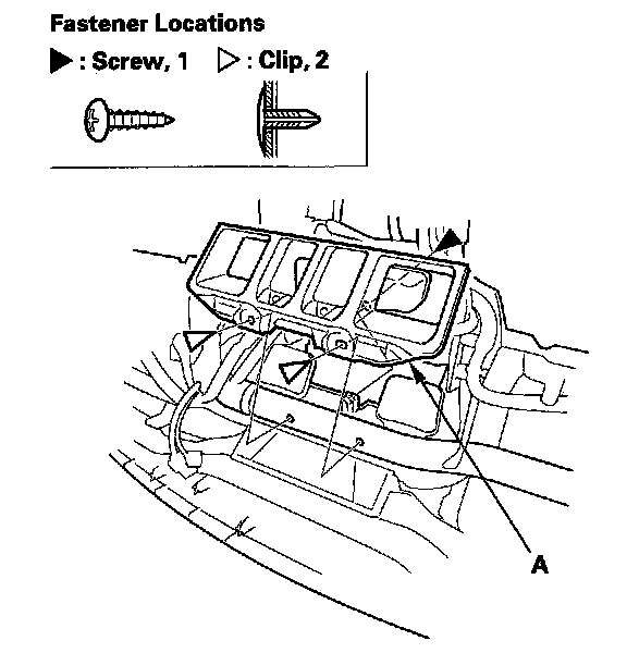 8. Remove the screw and the clips, then remove the dashboard center duct (A).