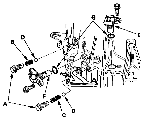 4. Remove the set screws (A), 22.0 mm spring (B), 27.4 mm spring (C), steel balls (D), input shaft (mainshaft) speed sensor (E), output shaft (countershaft) speed sensor (F), and O-rings (G).