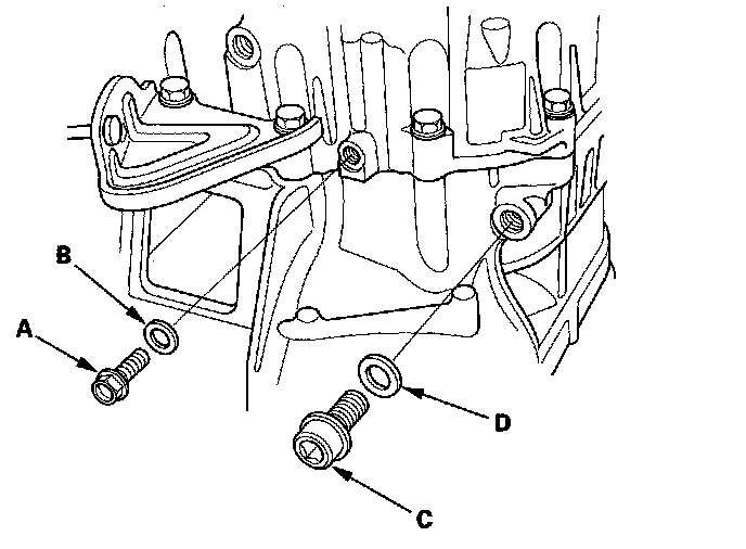 5. Remove the oil check bolt (A), 6 mm sealing washer (B), drain plug (C), and 14 mm sealing washer (D).