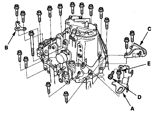 6. Remove transmission hanger A, transmission hanger B, clutch line bracket (C) and 8 x 16 mm flange bolt (D), and 10 x 20 mm flange bolt (E). Loosen the 10 x 40 mm flange bolts in a crisscross pattern in several steps, then remove them.