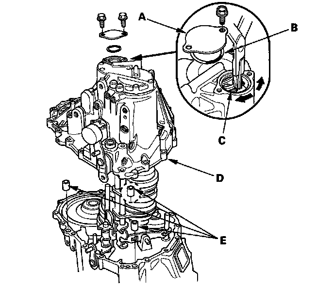 9. Remove the transmission housing (D) and the three 14 x 20 mm dowel pins (E).