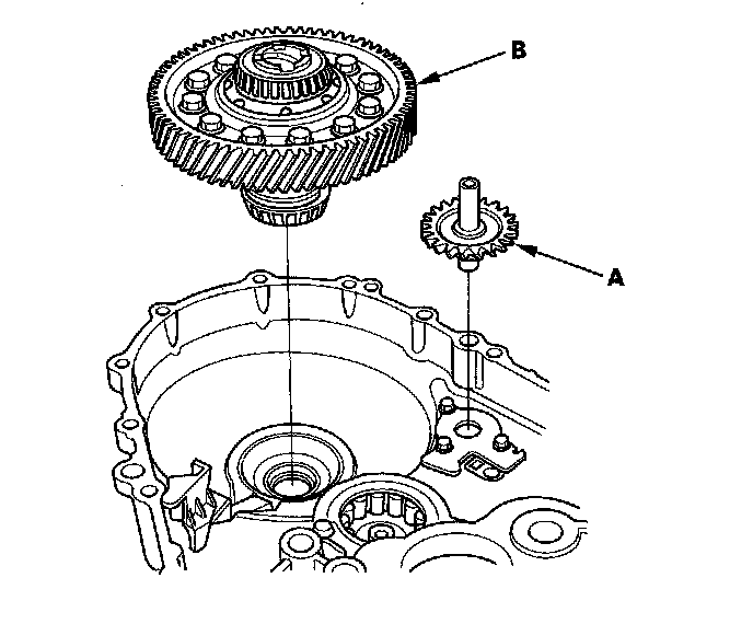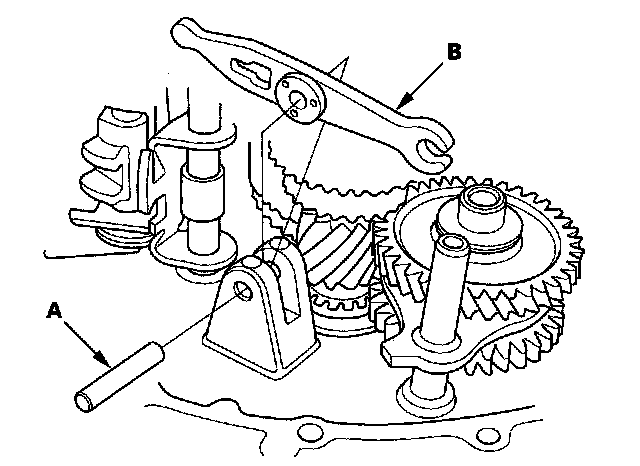 17. Remove the oil pump shaft (A) and differential assembly (B).