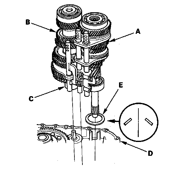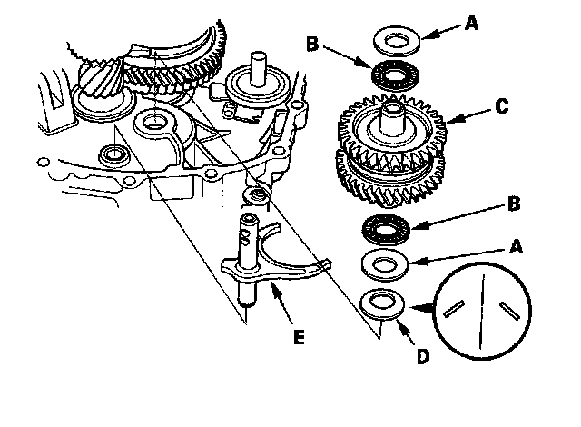 12. Remove the 20 mm thrust washers (A), 20 mm thrust needle bearings (B), reverse idler gear shaft assembly (C), 33 mm spring washer (D), and reverse shift fork (E) as an assembly.