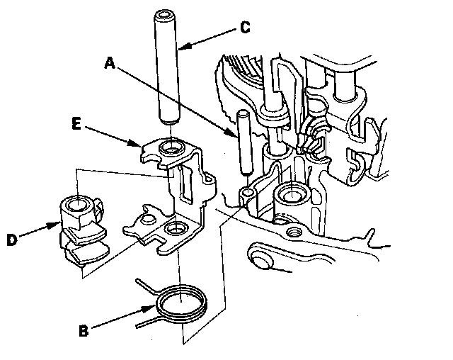 13. Remove the 8 x 50 mm pin (A), select return spring (B), shift piece shaft (C), shift piece (D) and interlock (E).