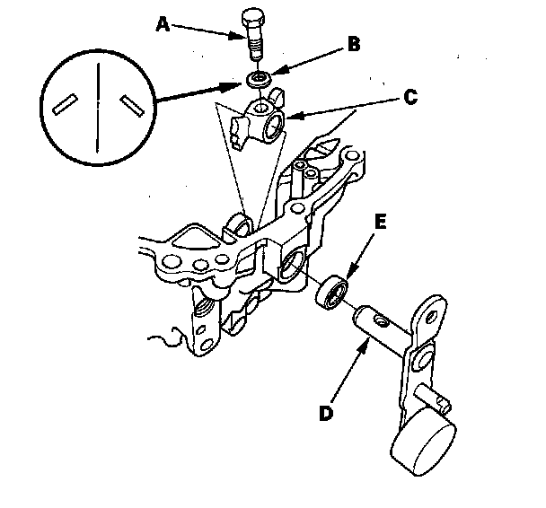 20. Remove the 8 mm special bolt (A), 8 mm spring washer (B), shift arm (C), shift lever (D), and 16 x 23 x 5 mm dust seal (E).