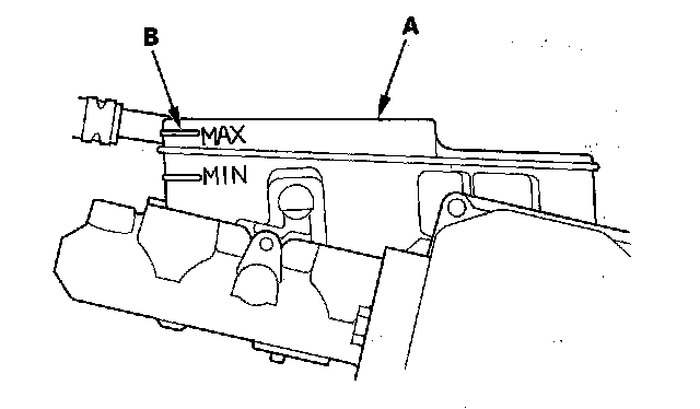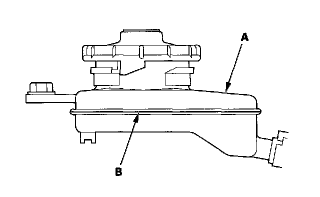 5. Check that the brake fluid level in the reservoir is at the MAX (upper) level line (B).
