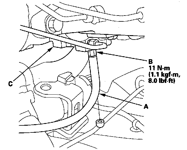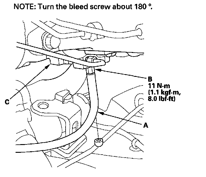 8. Attach a length of clear drain tube (A) to the bleed screw (B) under the servo unit (C), and loosen the bleed screw.