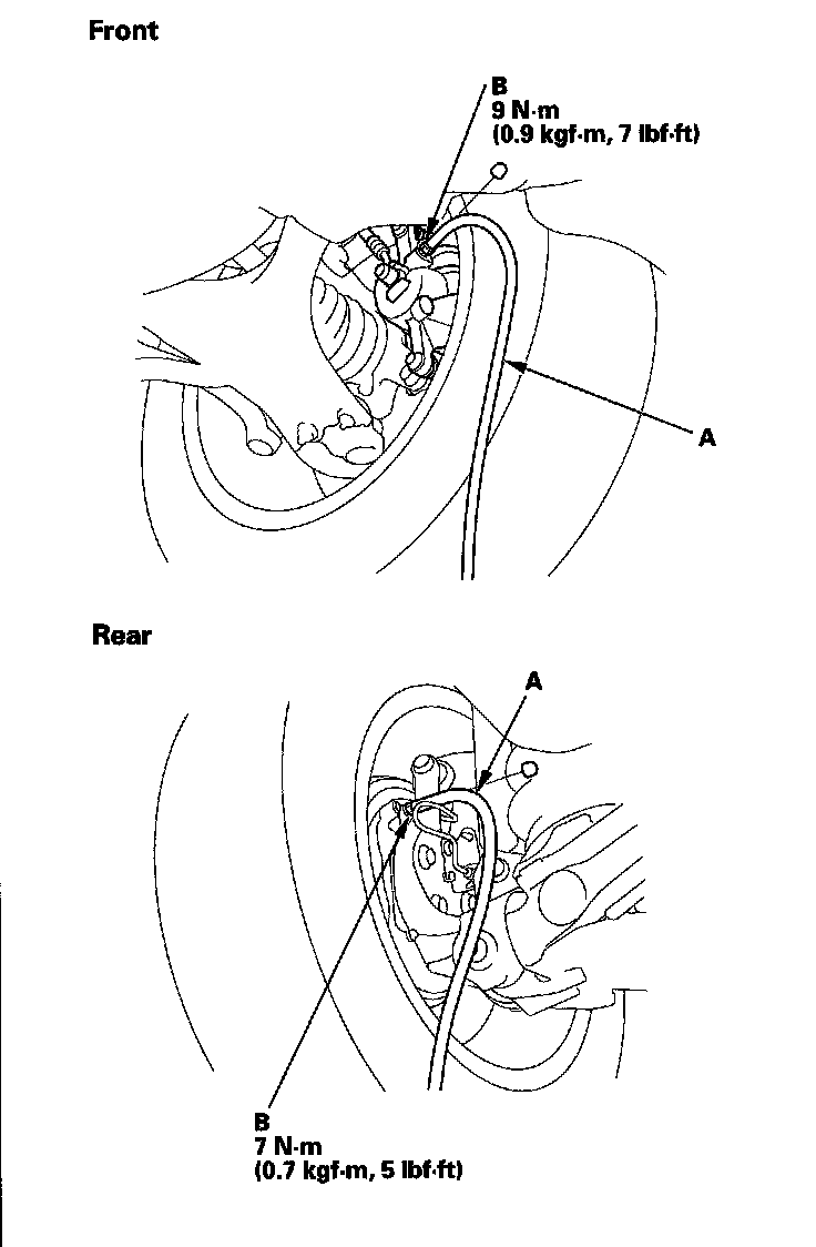 3. Attach a length of drain tube (A) to the bleed screw (B) on the caliper or wheel cylinder.