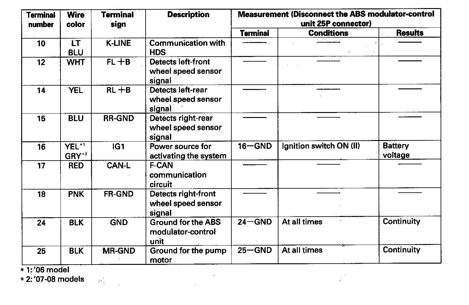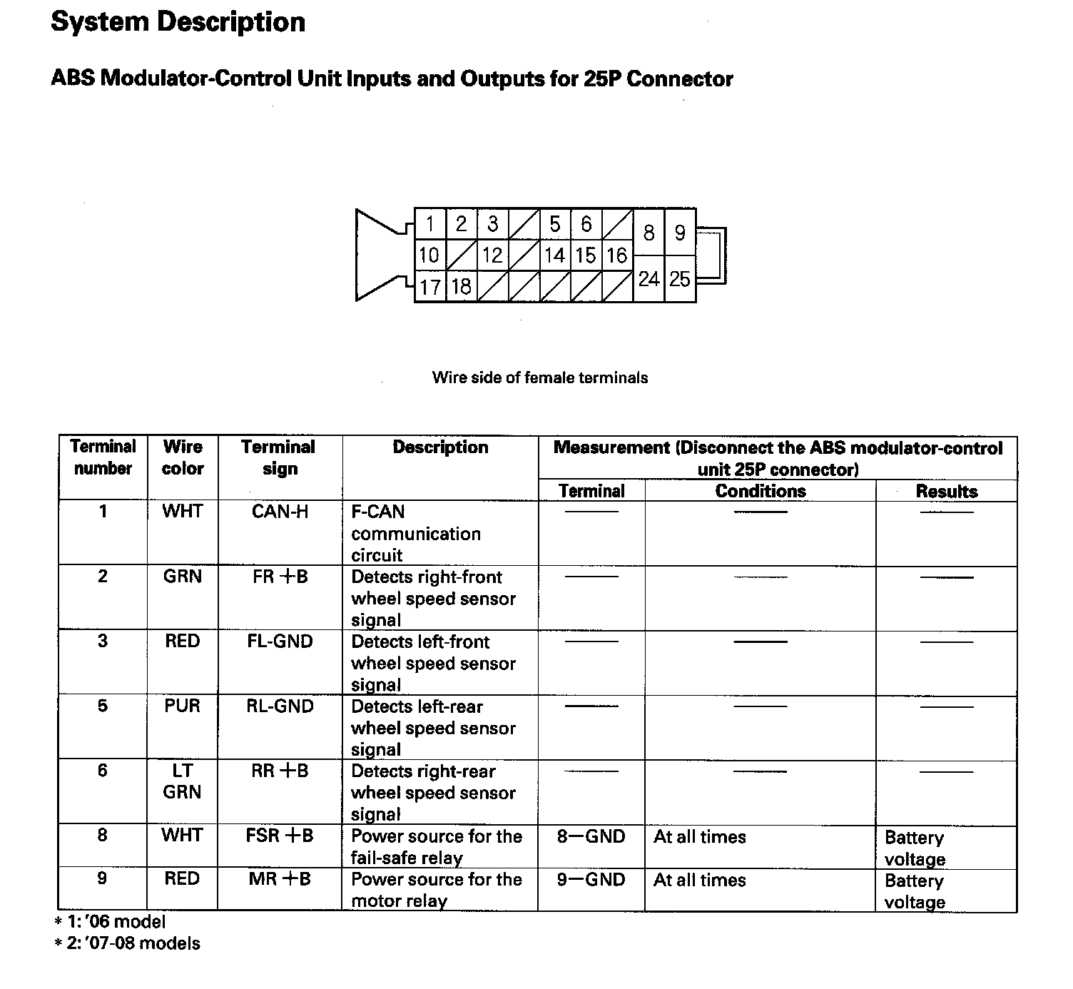 ABS Modulator-Control Unit Inputs and Outputs for 25P Connector (Part 1):
