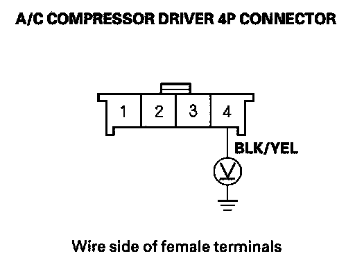 4. Measure the voltage between the A/C compressor driver 4P connector No. 4 terminal and body ground.