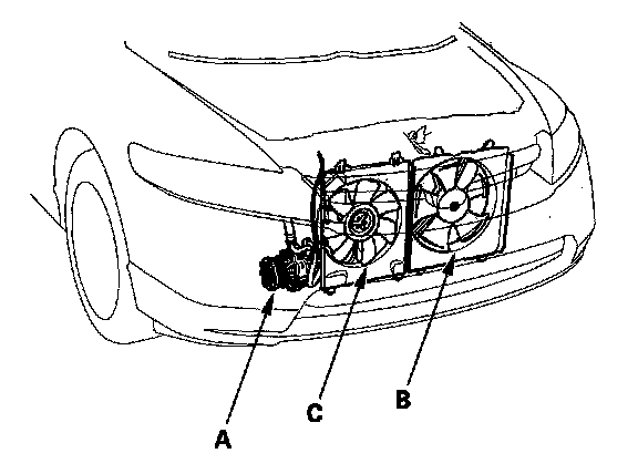 - Check that the radiator fan (B) and A/C condenser fan (C) operate when the A/C compressor clutch is engaged.
