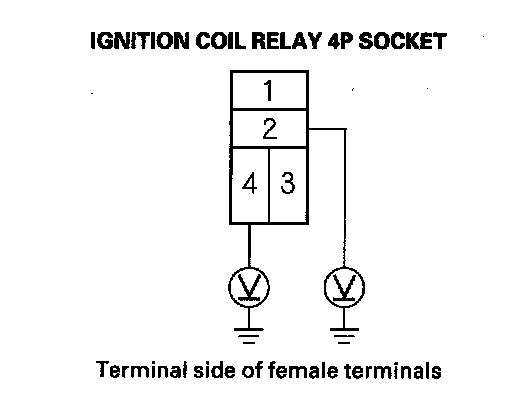 4. Measure the voltage between ignition coil relay 4P socket terminal No. 2 and body ground, then terminal No. 4 and body ground.