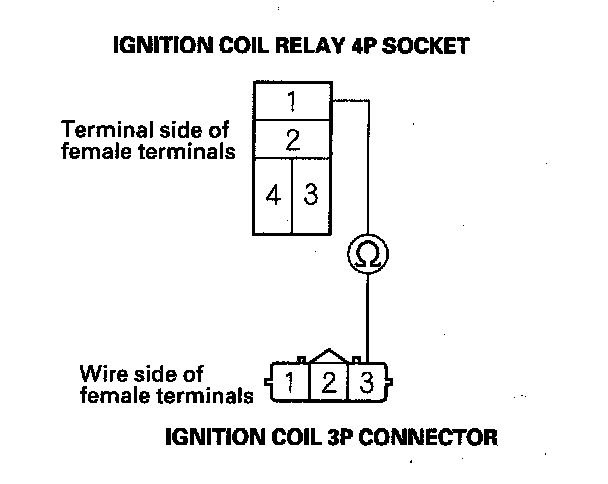 5. Check for continuity between each ignition coil relay 4P socket terminal No. 1 and ignition coil 3P connector terminal No. 3.