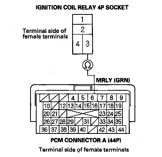 NO - Repair open in the wire between ignition coil relay 4P socket terminal No. 3 and the PCM (A6).