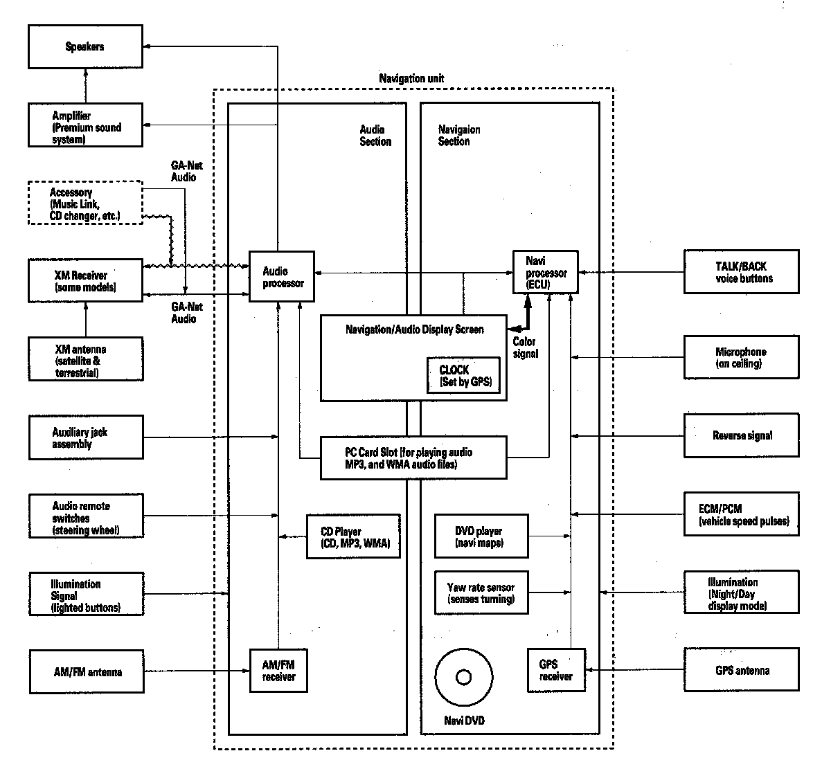 The internal GA-Net II bus passes information back and forth between the navigation display, the navigation unit, and the audio system components. The information passed on this bus are touch button commands, audio muting signal, audio (radio and XM), and any open in these bus lines can affect the navigation system or other audio accessory operation.