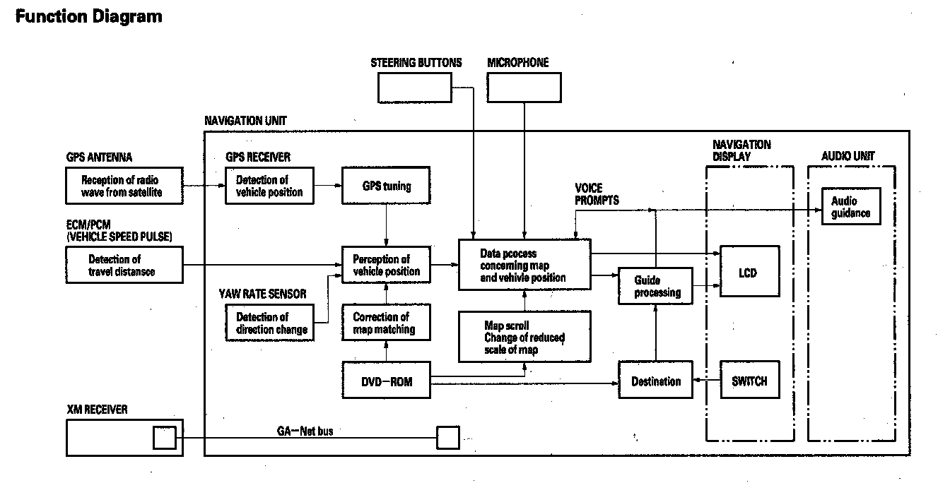The navigation system is composed of the navigation unit, the ECM/PCM (vehicle speed signal), the GPS antenna, microphone, voice control switch, XM receiver, and the climate control unit. These units communicate with each other on the GA-Net bus.