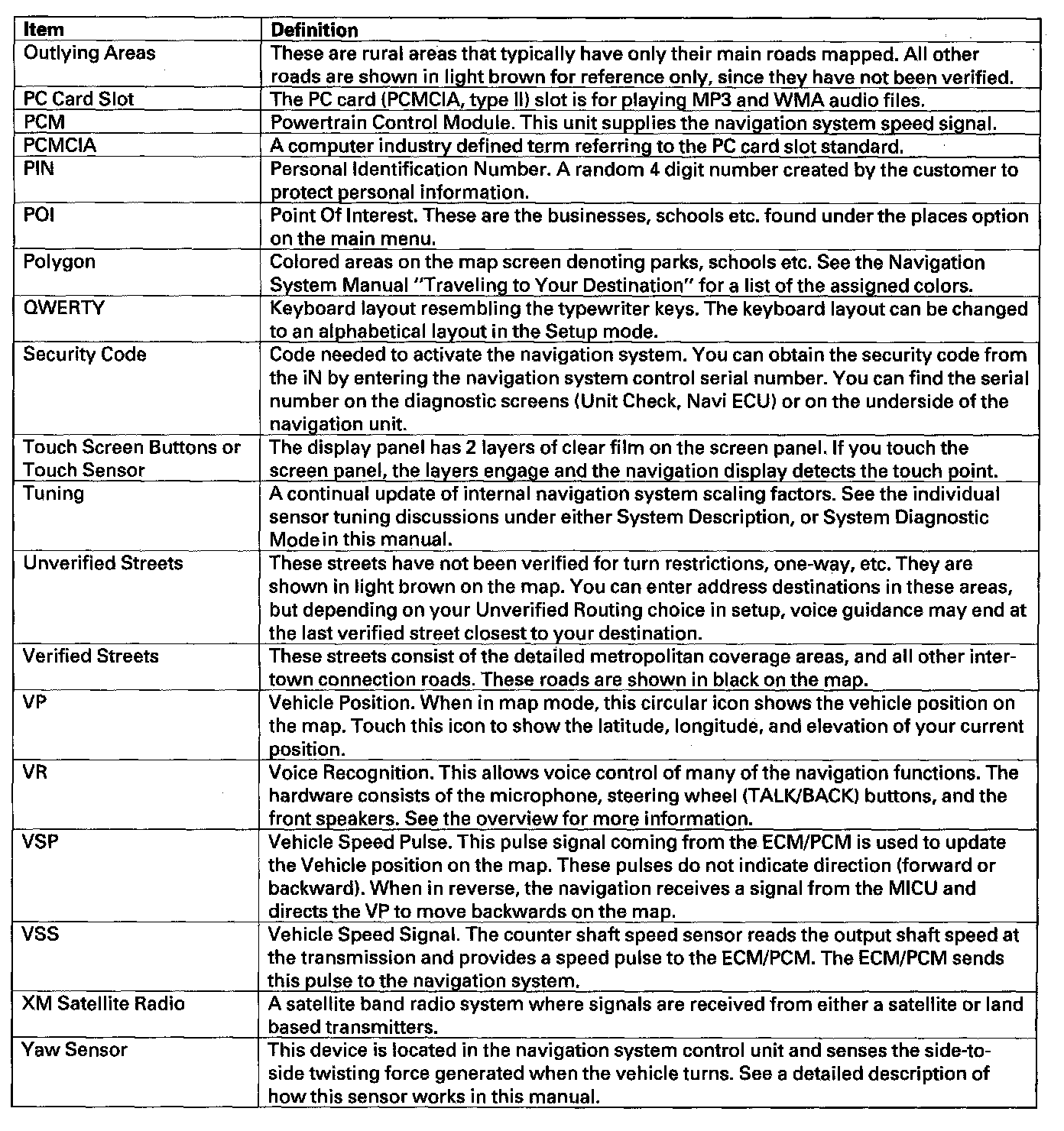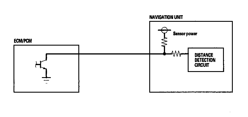 Signals from the system's yaw rate sensor (inside the navigation unit) detects turns, and the ECM/PCM vehicle speed pulse (VSP) and reverse signal enable the system to keep track of the vehicle's speed and direction of travel. The advantage of this hybrid system is that the system can track your position if either the GPS signal or the vehicle speed signal is missing. For instance, when in a tunnel (no GPS), the speed signal is used to update your position on the map. Alternately, while the vehicle is being transported on a ferry, GPS signals can show the vehicle position on the map as it crosses the water.